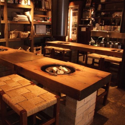 【1階/テーブル席】自然な会話が楽しめるよう、あえて低めに設計されたテーブル席。日本の文化を活かした和の落ち着いた雰囲気が自慢です。食後は炭火を見ながらゆっくりと落ち着いた時間を過ごせます。